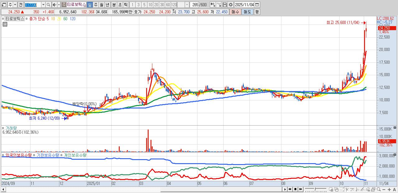 - 티로보틱스 (24,250원 ▲ 1.46% , 시총: 4,862억, 거래량: 6,952,640, 거래대금:1,660억, KOSDAQ)