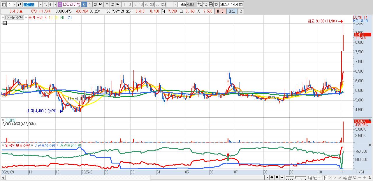 - LS티라유텍 (8,410원 ▲ 11.54% , 시총: 1,760억, 거래량: 8,009,476, 거래대금:667억, KOSDAQ)