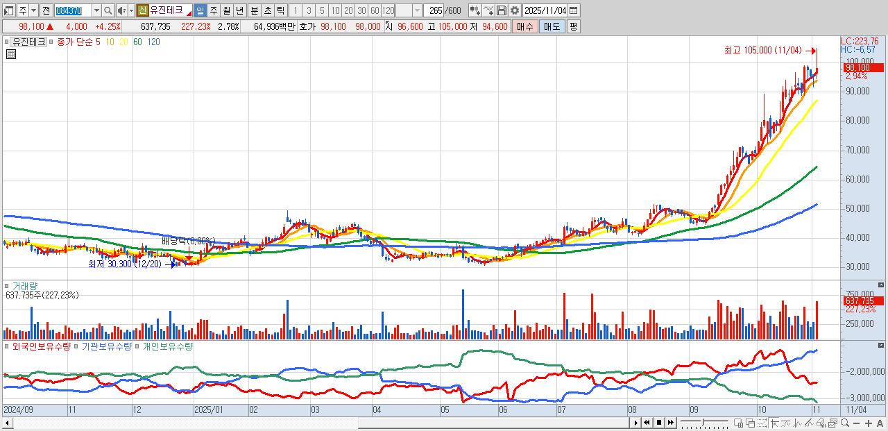 - 유진테크 (101,800원 ▲ 8.18% , 시총: 23,329억, 거래량: 427,282, 거래대금:437억, KOSDAQ)