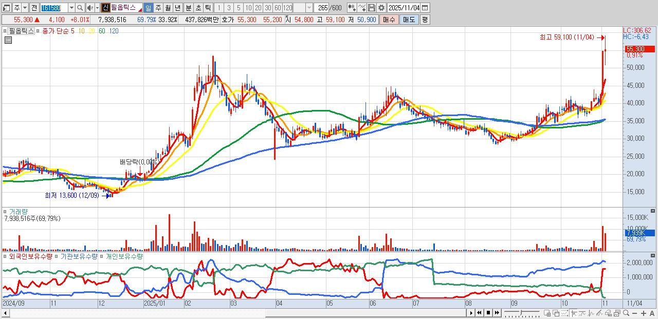 - 필옵틱스 (57,300원 ▲ 11.91% , 시총: 13,410억, 거래량: 3,145,318, 거래대금:1,735억, KOSDAQ)