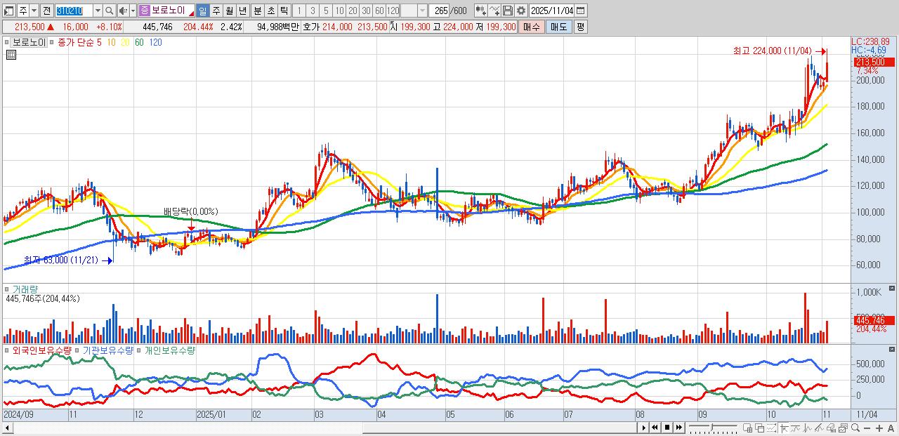 - 보로노이 (219,000원 ▲ 10.89% , 시총: 40,281억, 거래량: 235,998, 거래대금:505억, KOSDAQ)