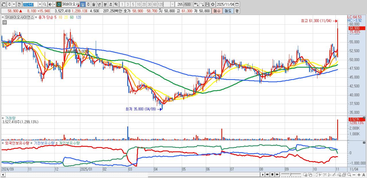 SK바이오사이언스 60,100원 ▲ 18.31% (KOSPI, 302440)