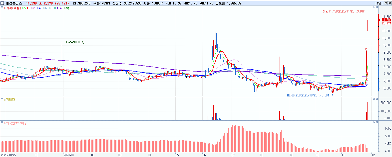 - 대상홀딩스 (11,290원 ▲ 25.17% , 시총: 4,088억, 거래량: 21,427,128, 거래대금:2,385억)