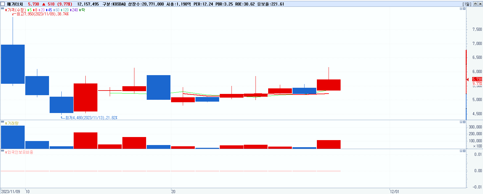 - 메가터치 (5,730원 ▲ 9.77% , 시총: 1,190억, 거래량: 12,182,884, 거래대금:707억)