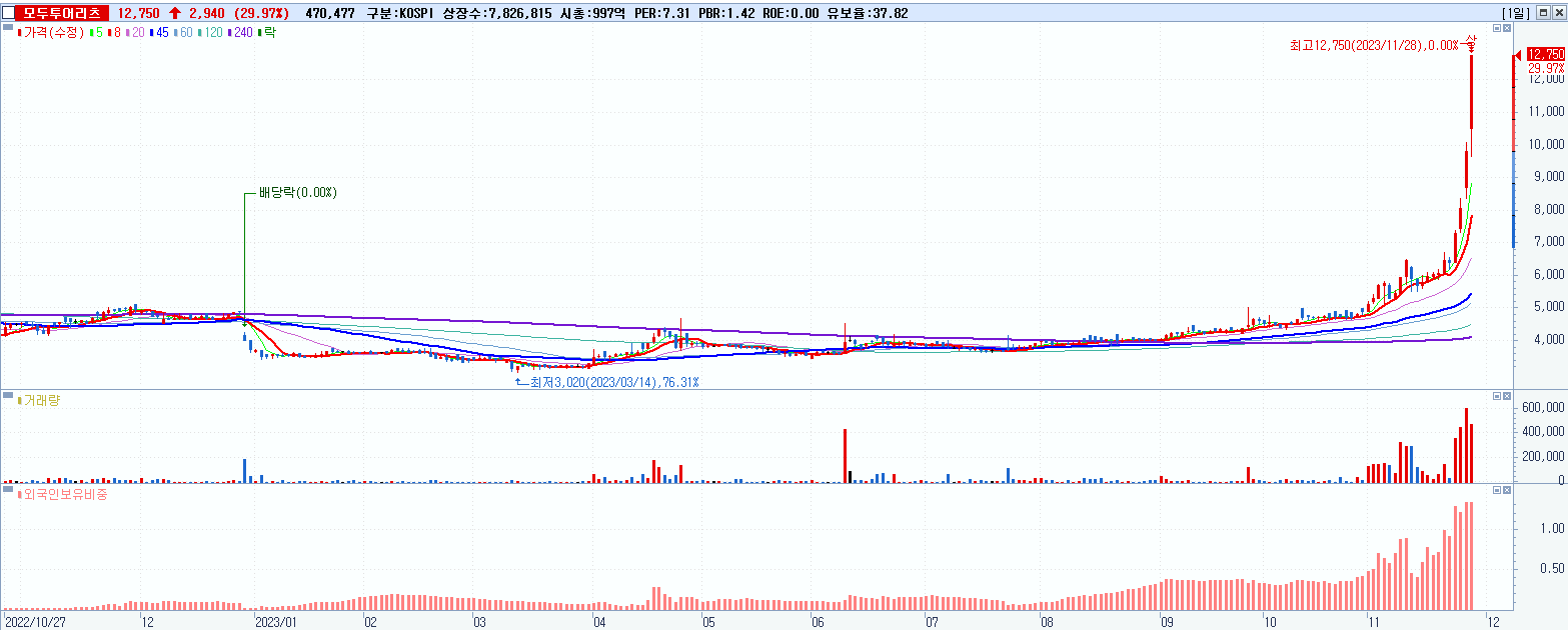 - 모두투어리츠 (12,750원 ▲ 29.97% , 시총: 998억, 거래량: 470,650, 거래대금:51억)