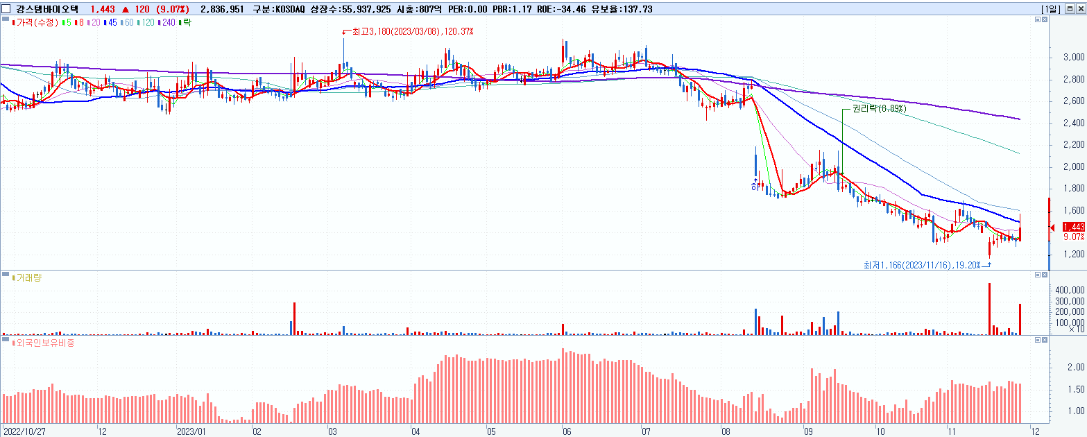 - 강스템바이오텍 (1,443원 ▲ 9.07% , 시총: 807억, 거래량: 2,836,955, 거래대금:42억)