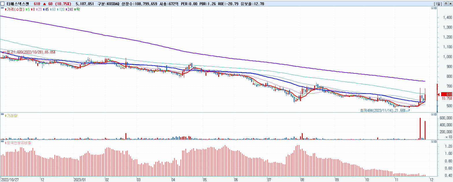 - 티에스넥스젠 (618원 ▲ 10.75% , 시총: 672억, 거래량: 5,187,551, 거래대금:33억)
