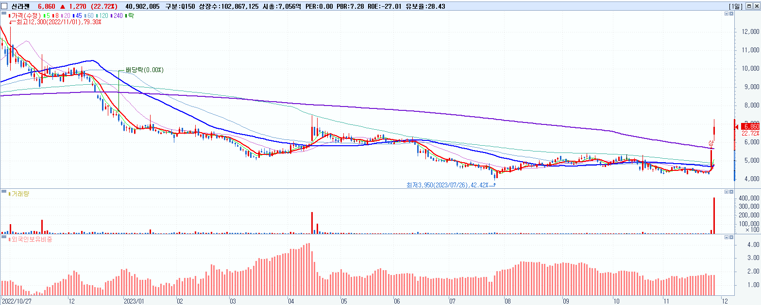 - 신라젠 (6,860원 ▲ 22.72% , 시총: 7,057억, 거래량: 40,947,045, 거래대금:2,786억)