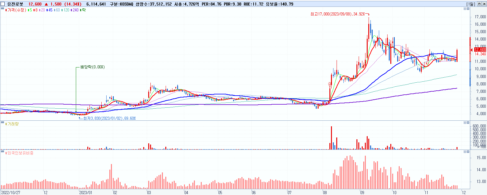 - 유진로봇 (12,600원 ▲ 14.34% , 시총: 4,727억, 거래량: 6,118,342, 거래대금:738억)