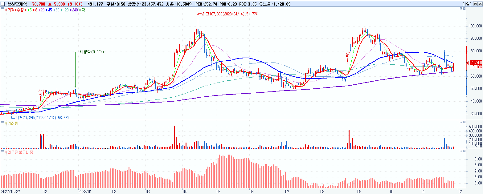 - 삼천당제약 (70,700원 ▲ 9.1% , 시총: 16,584억, 거래량: 491,395, 거래대금:332억)