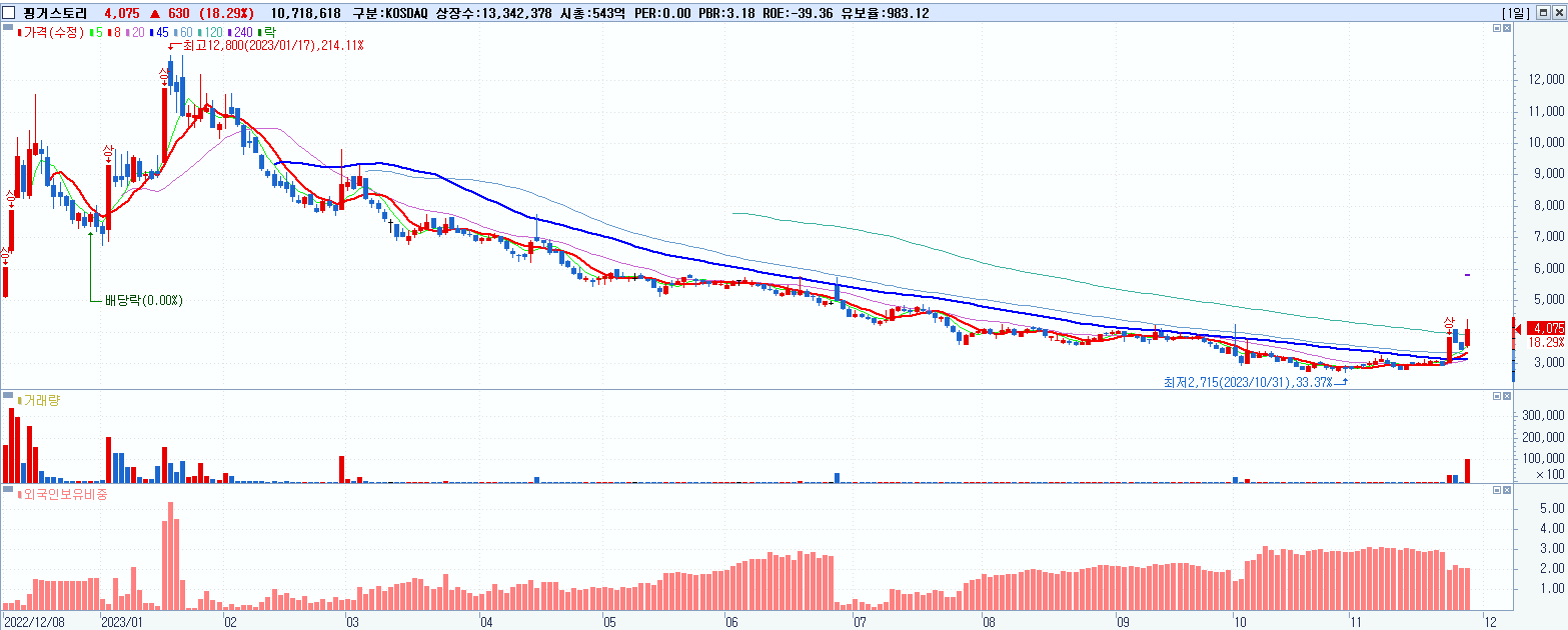 - 핑거스토리 (4,075원 ▲ 18.29% , 시총: 544억, 거래량: 10,732,191, 거래대금:442억)