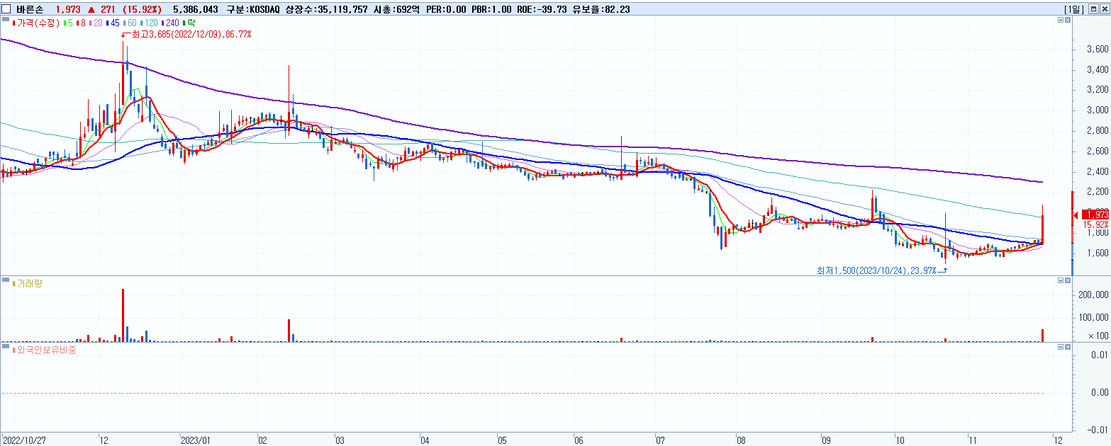 - 바른손 (1,973원 ▲ 15.92% , 시총: 693억, 거래량: 5,437,509, 거래대금:105억)
