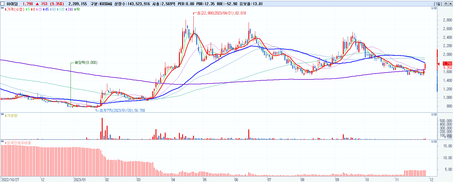 - 하이딥 (1,790원 ▲ 9.35% , 시총: 2,569억, 거래량: 2,210,322, 거래대금:39억)