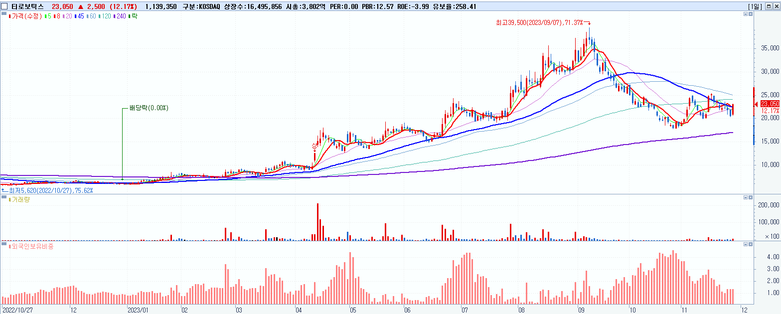 - 티로보틱스 (23,050원 ▲ 12.17% , 시총: 3,802억, 거래량: 1,139,874, 거래대금:252억)