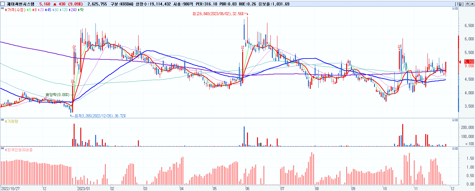 - 제이씨현시스템 (5,160원 ▲ 9.09% , 시총: 986억, 거래량: 2,643,857, 거래대금:131억)