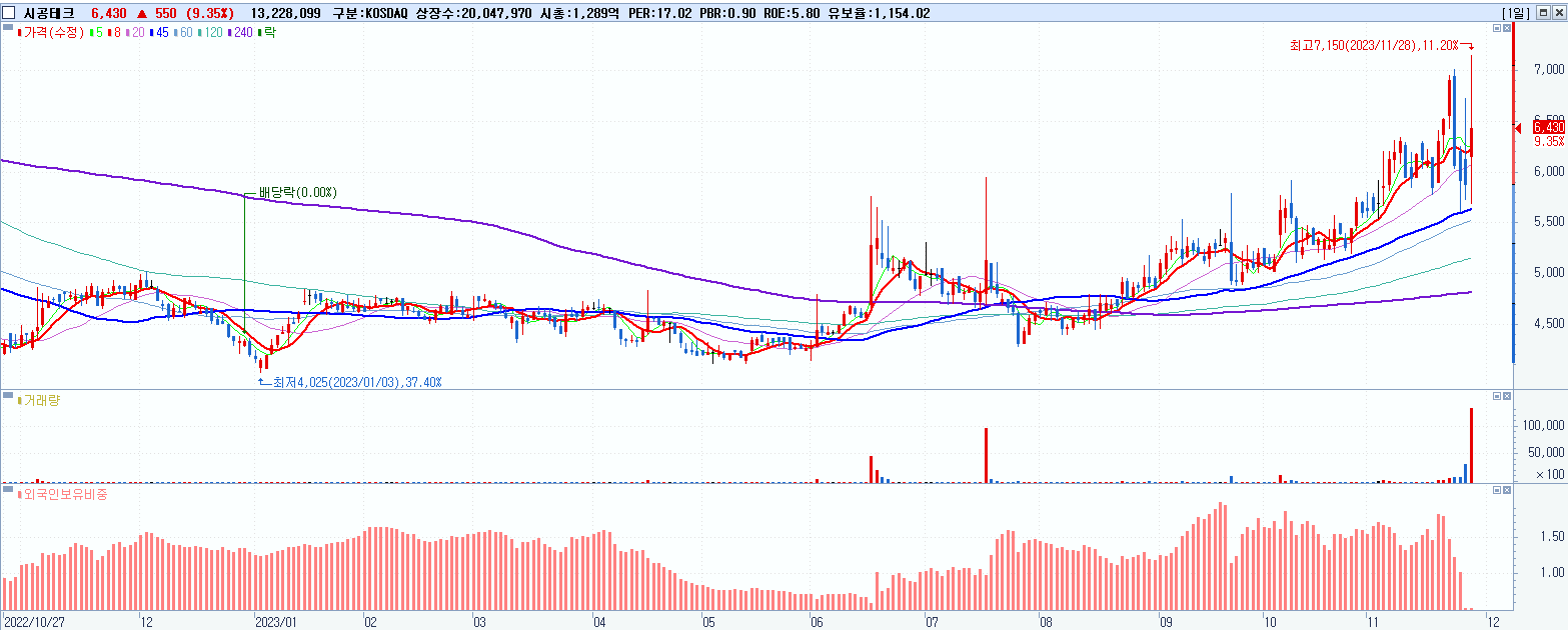 - 시공테크 (6,430원 ▲ 9.35% , 시총: 1,289억, 거래량: 13,241,813, 거래대금:878억)