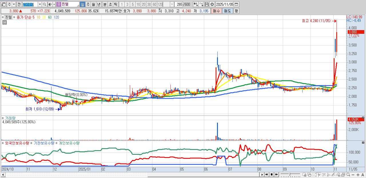 - 핀텔 (3,880원 ▲ 17.22% , 시총: 441억, 거래량: 4,049,589, 거래대금:157억)