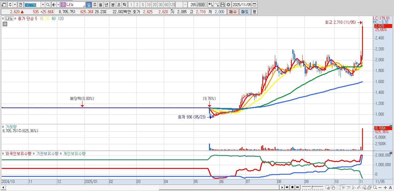 - 나노 (2,620원 ▲ 25.66% , 시총: 808억, 거래량: 8,705,751, 거래대금:220억)