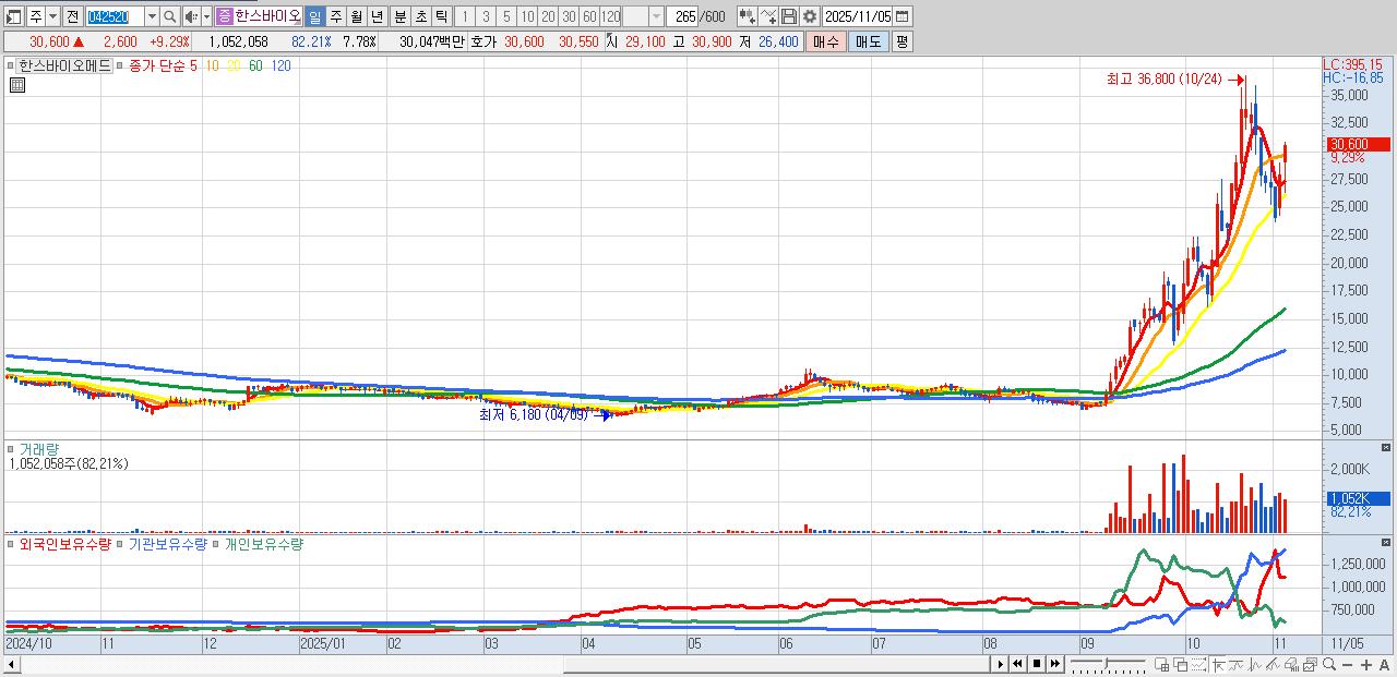 - 한스바이오메드 (30,600원 ▲ 9.29% , 시총: 4,139억, 거래량: 1,052,058, 거래대금:300억)
