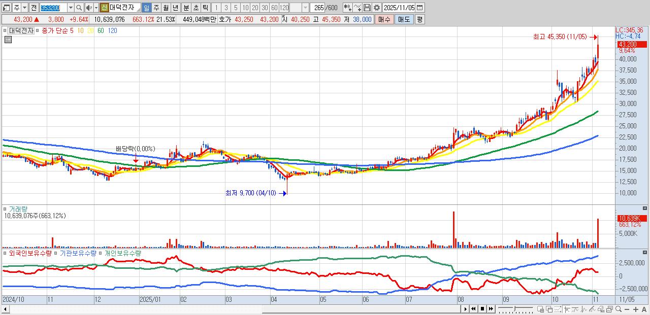 - 대덕전자 (43,200원 ▲ 9.64% , 시총: 21,348억, 외국인 순매수 거래금:161억)