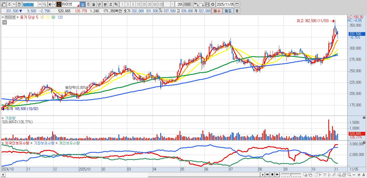- 하이브 (332,000원 ▼ -2.64% , 시총: 139,822억, 외국인 순매수 거래금:257억)