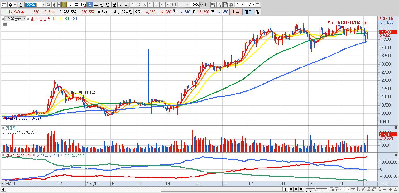 - LG유플러스 (14,970원 ▲ 2.89% , 시총: 64,345억, 외국인 순매수 거래금:76억)
