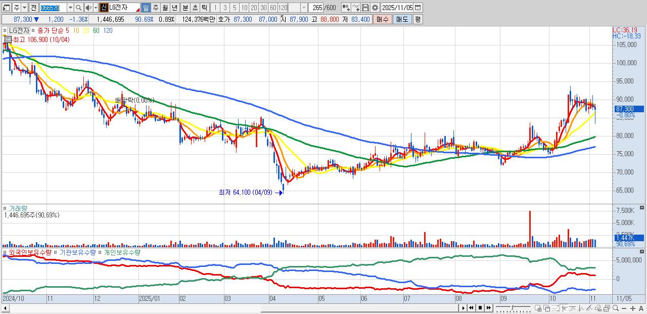 - LG전자 (87,100원 ▼ -1.58% , 시총: 141,874억, 외국인 순매수 거래금:64억)