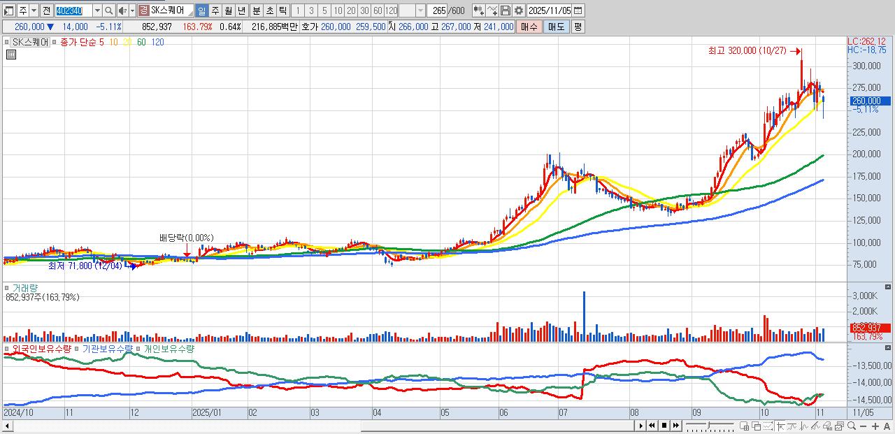 - SK스퀘어 (260,000원 ▼ -5.11% , 시총: 344,606억, 외국인 순매수 거래금:77억)