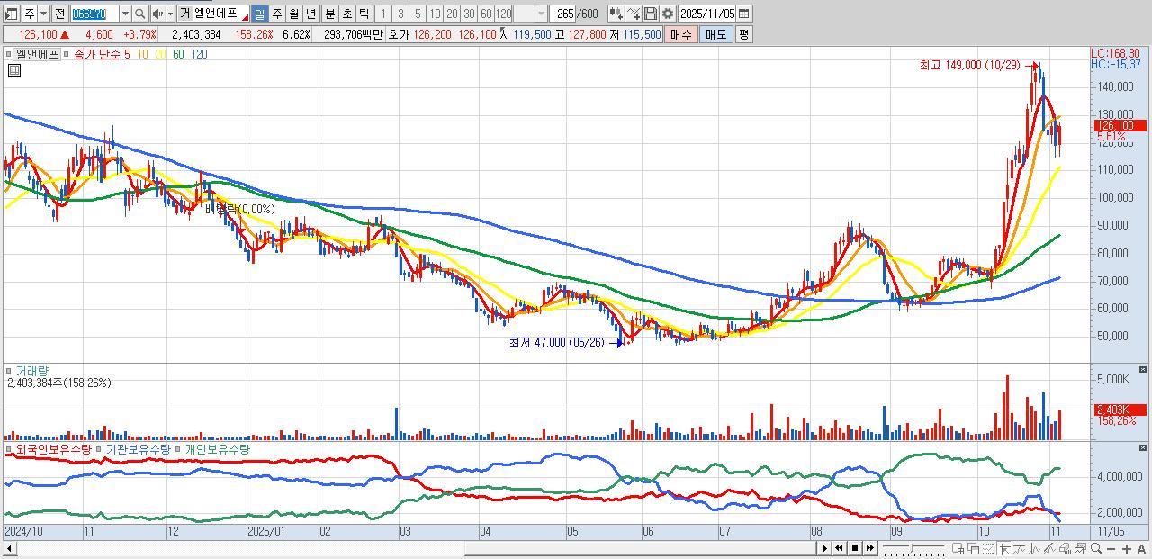 - 엘앤에프 (125,600원 ▲ 3.37% , 시총: 45,613억, 외국인 순매수 거래금:265억)