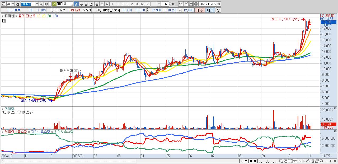 - 파미셀 (18,100원 ▼ -1.04% , 시총: 10,863억, 외국인 순매수 거래금:64억)