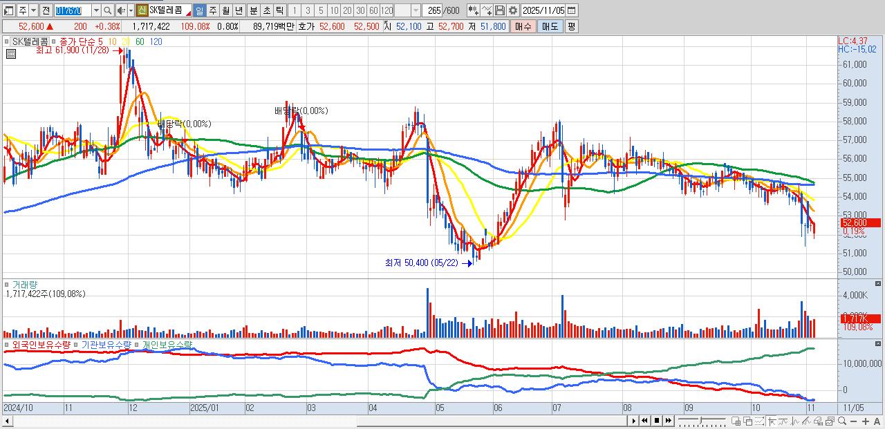 - SK텔레콤 (52,700원 ▲ 0.57% , 시총: 113,194억, 외국인 순매수 거래금:59억)