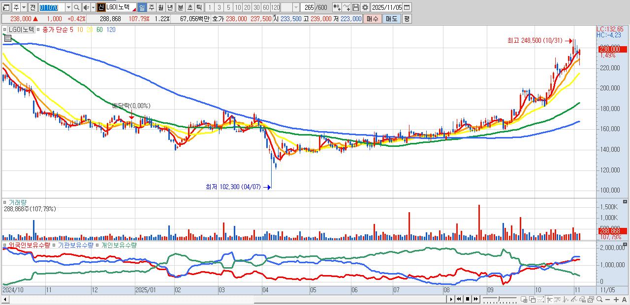 - LG이노텍 (234,500원 ▼ -1.05% , 시총: 55,499억, 외국인 순매수 거래금:109억)