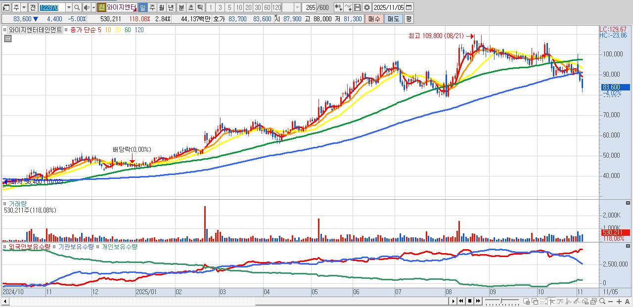 - 와이지엔터테인먼트 (83,800원 ▼ -4.77% , 시총: 15,663억, 외국인 순매수 거래금:106억)