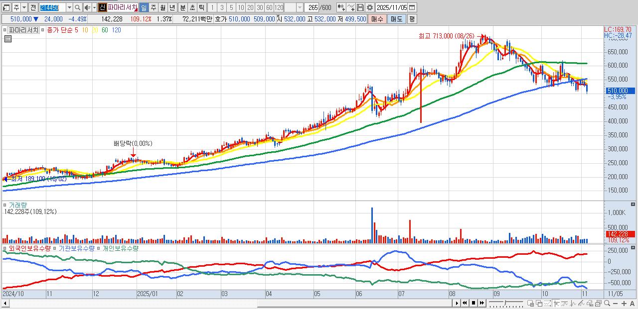 - 파마리서치 (508,000원 ▼ -4.87% , 시총: 52,779억, 외국인 순매수 거래금:69억)