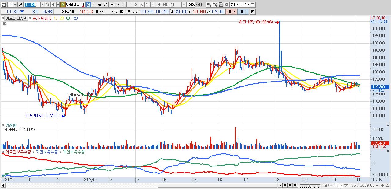 - 아모레퍼시픽 (120,100원 ▼ -0.41% , 시총: 70,250억, 외국인 순매수 거래금:52억)