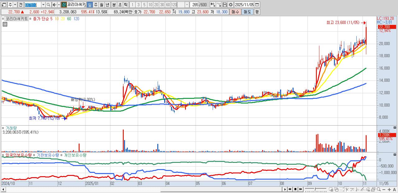 - 코리아써키트 (22,700원 ▲ 12.94% , 시총: 5,362억, 외국인 순매수 거래금:75억)