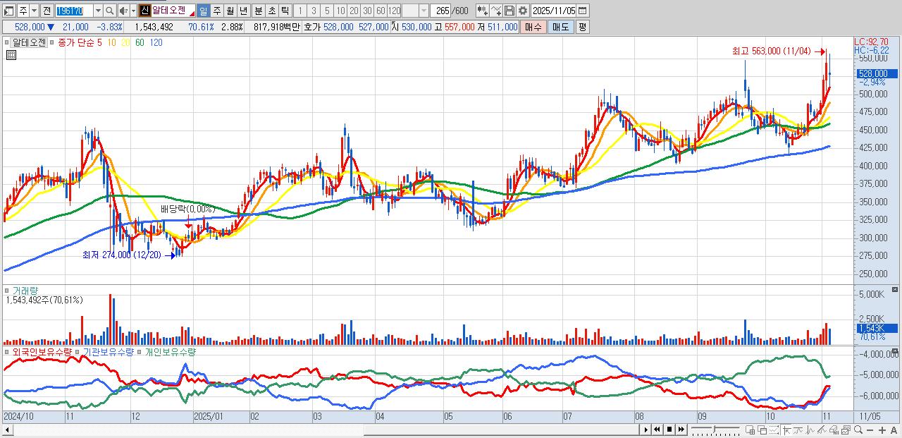 - 알테오젠 (529,000원 ▼ -3.64% , 시총: 283,046억, 거래량: 793,188, 거래대금:4,179억)