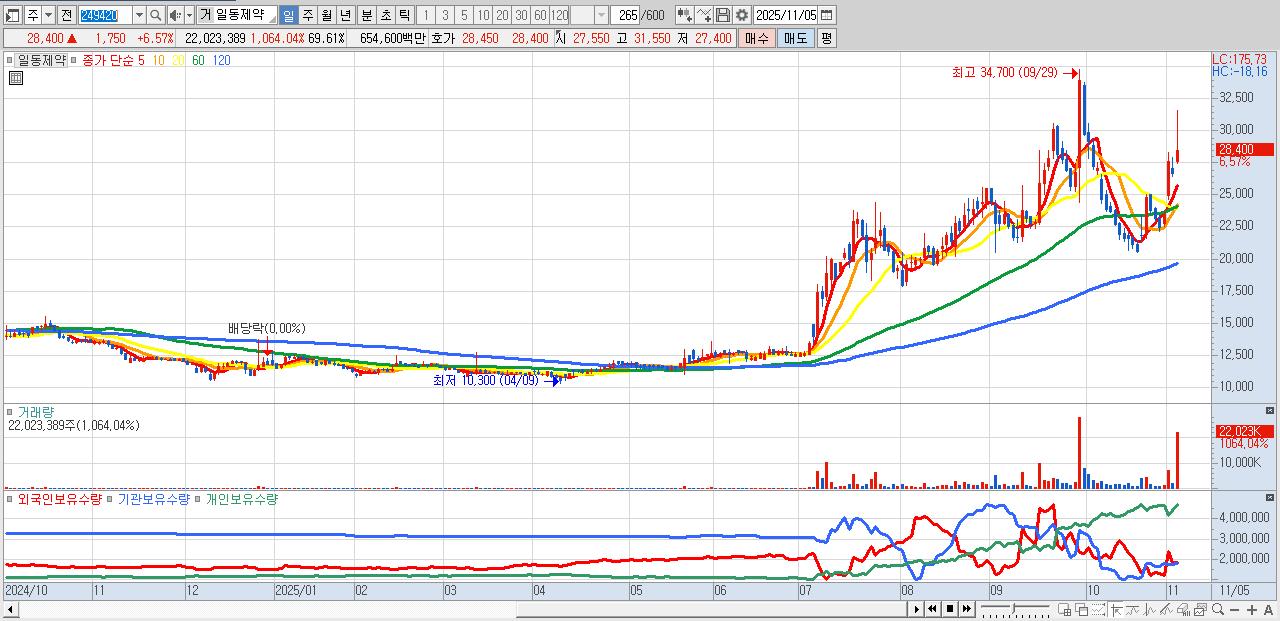 - 일동제약 (28,400원 ▲ 6.57% , 시총: 8,985억, 거래량: 22,023,389, 거래대금:6,546억)