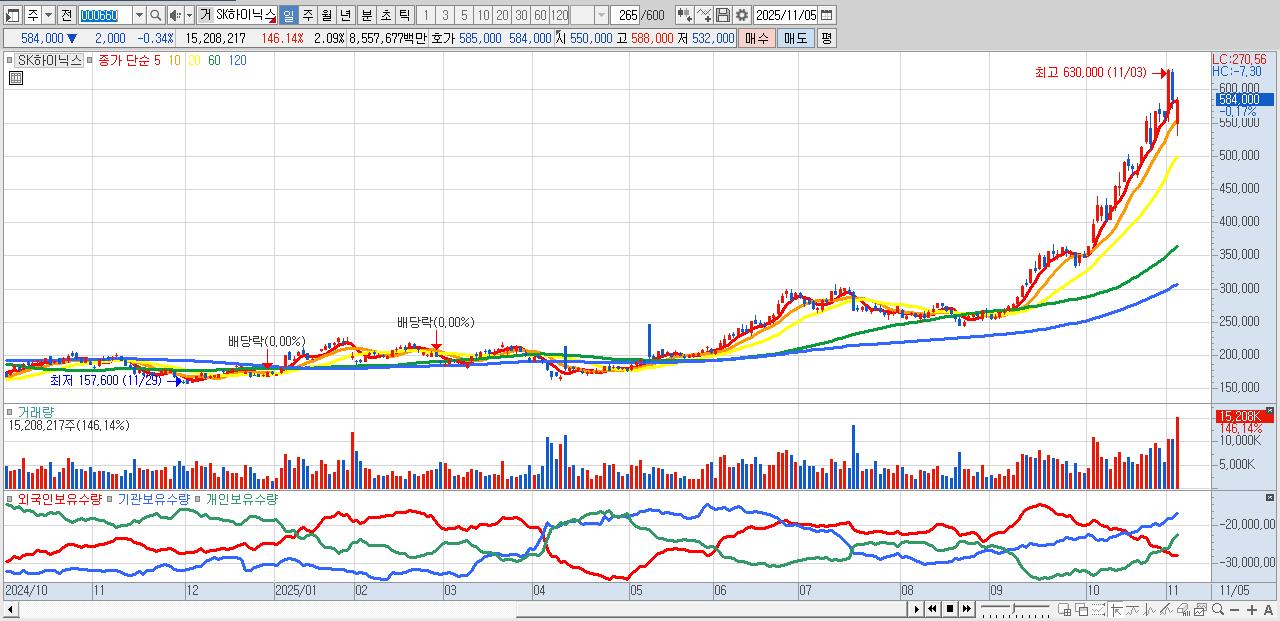 - SK하이닉스 (579,000원 ▼ -1.19% , 시총: 4,215,134억, 거래량: 8,976,222, 거래대금:50,438억)
