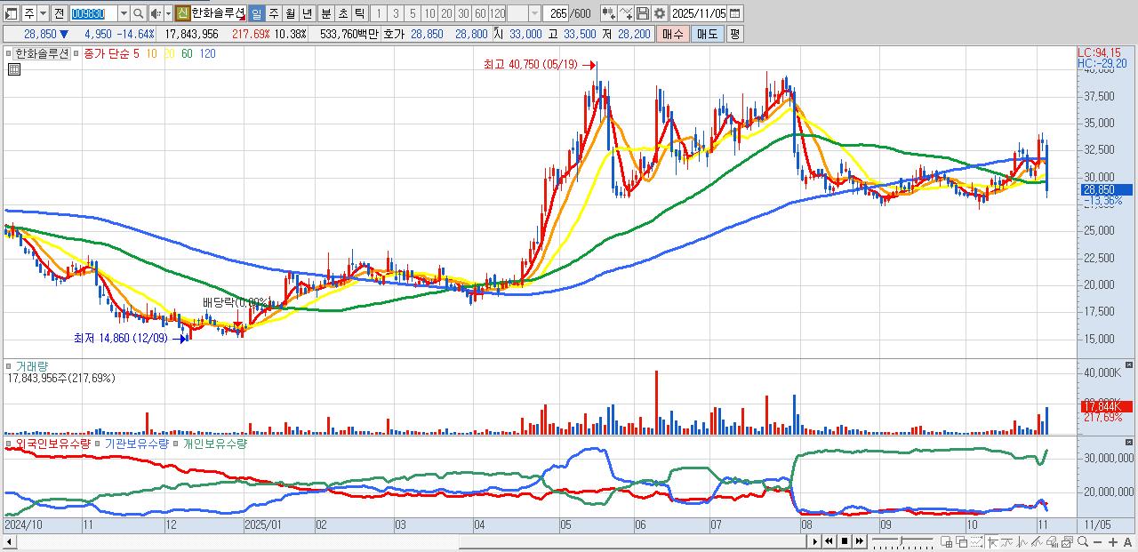 - 한화솔루션 (28,750원 ▼ -14.94% , 시총: 49,419억, 거래량: 9,680,325, 거래대금:2,897억)