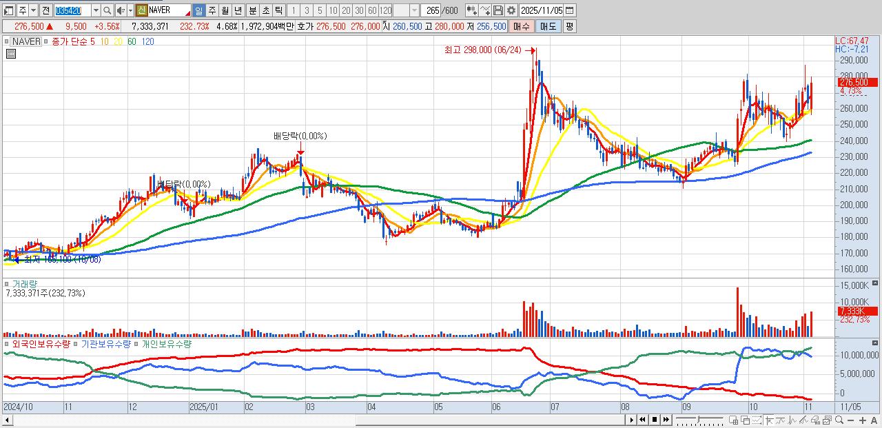 - NAVER (278,500원 ▲ 4.31% , 시총: 436,835억, 거래량: 3,470,467, 거래대금:9,320억)