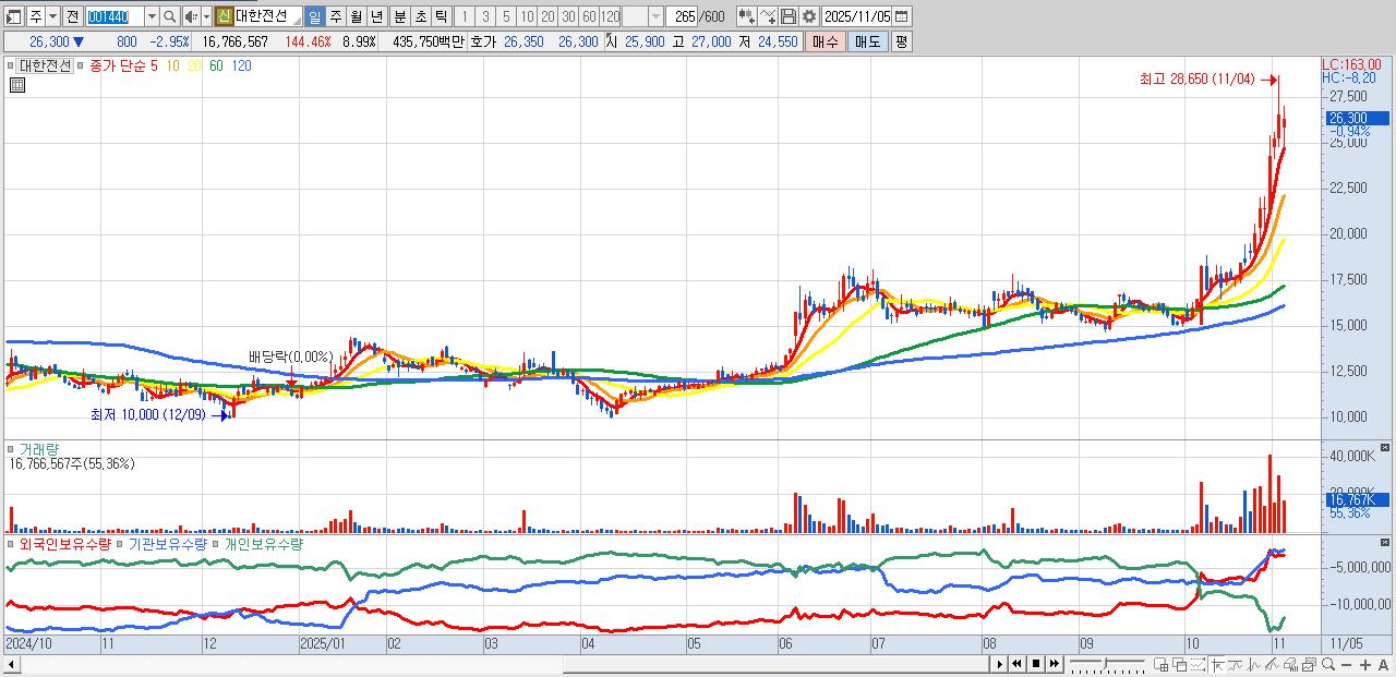 - 대한전선 (26,300원 ▼ -2.95% , 시총: 49,036억, 거래량: 16,766,567, 거래대금:4,358억)