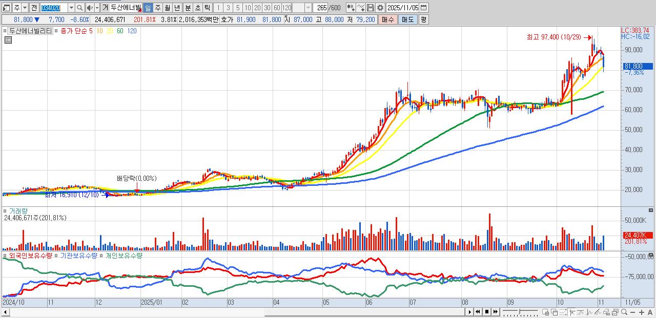 - 두산에너빌리티 (83,600원 ▼ -6.59% , 시총: 535,509억, 거래량: 12,058,956, 거래대금:9,936억)