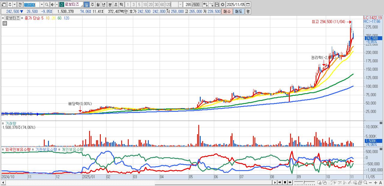 - 로보티즈 (242,500원 ▼ -9.85% , 시총: 32,060억, 거래량: 1,508,378, 거래대금:3,724억)