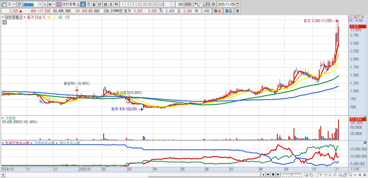 - 대한광통신 (3,025원 ▲ 17.93% , 시총: 3,993억, 거래량: 83,495,999, 거래대금:2,383억)