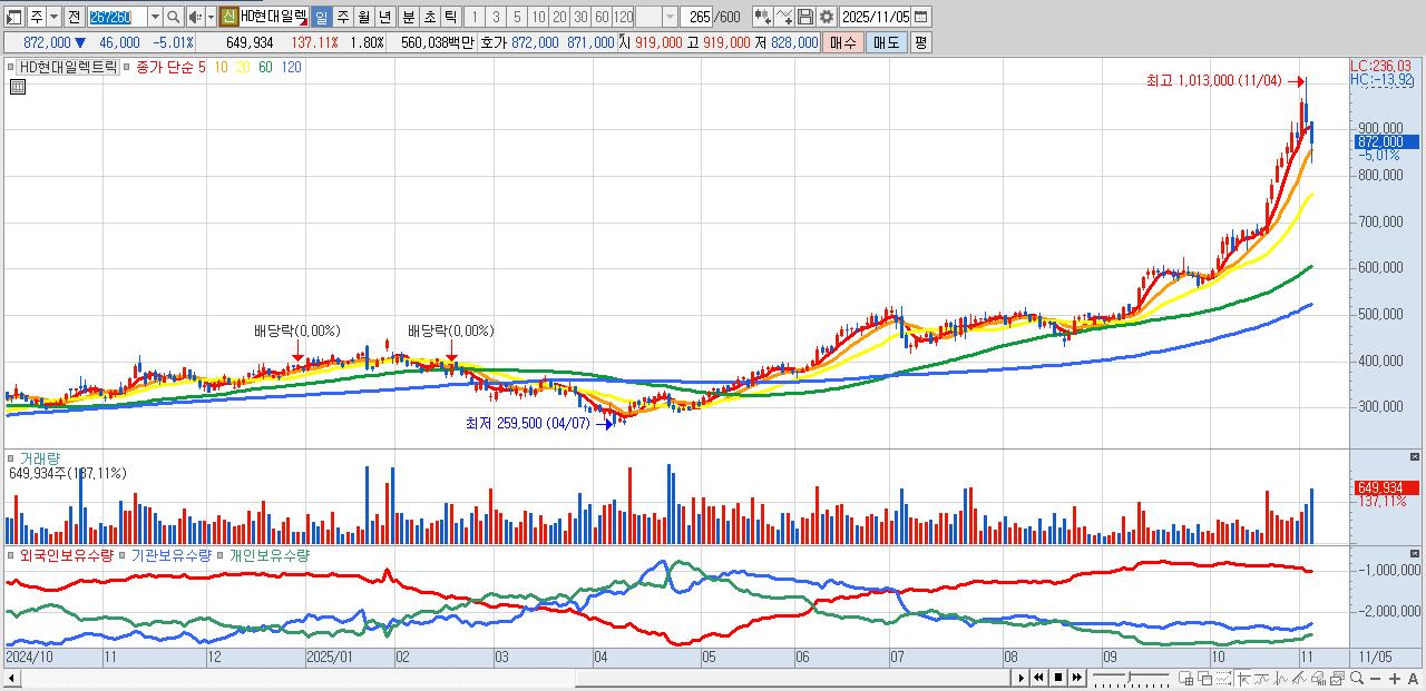 - HD현대일렉트릭 (868,000원 ▼ -5.45% , 시총: 312,889억, 거래량: 486,112, 거래대금:4,181억)