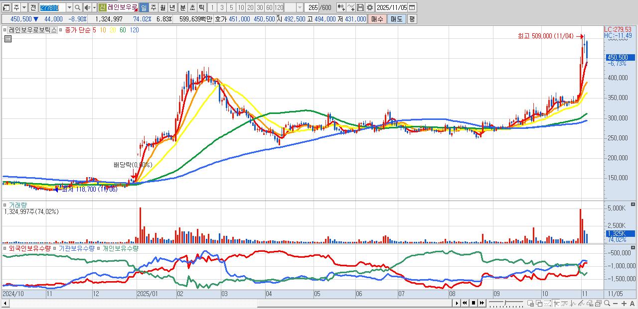 - 레인보우로보틱스 (458,000원 ▼ -7.38% , 시총: 88,851억, 거래량: 617,957, 거래대금:2,784억)