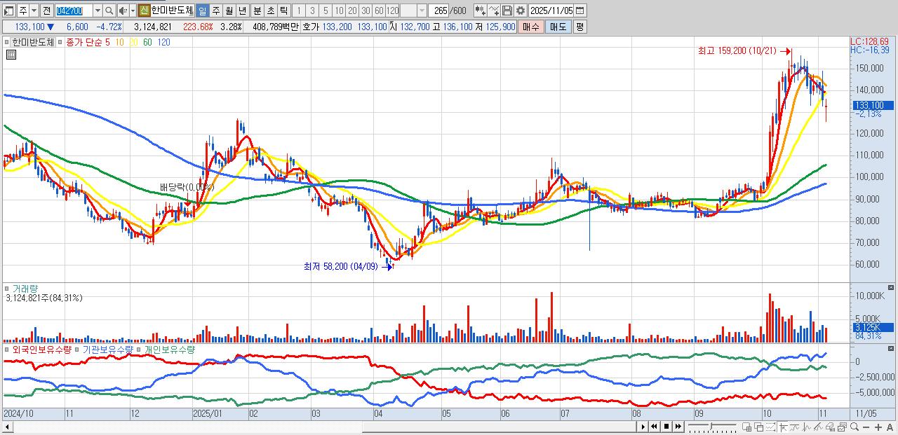 - 한미반도체 (133,100원 ▼ -4.72% , 시총: 126,861억, 거래량: 3,124,821, 거래대금:4,088억)