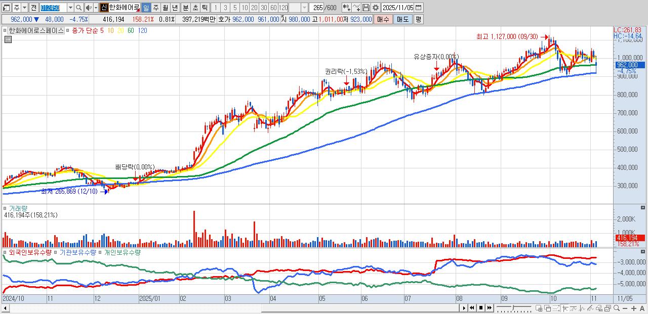 - 한화에어로스페이스 (950,000원 ▼ -5.94% , 시총: 489,852억, 거래량: 302,267, 거래대금:2,875억)