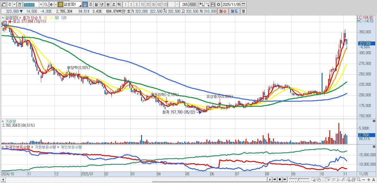 - 삼성SDI (325,000원 ▼ -3.7% , 시총: 261,903억, 거래량: 1,464,201, 거래대금:4,682억)